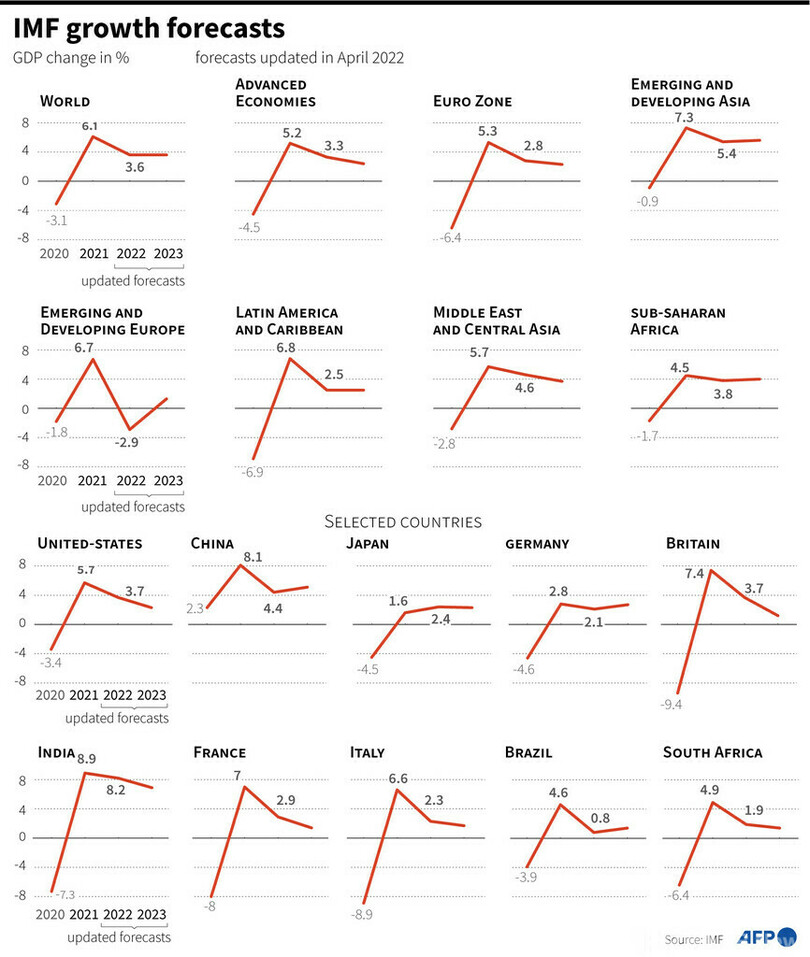 【4月20日 AFP】国際通貨基金(IMF)は19日、最新の世界経済見通し(World Economic Outlook)で、ロシアによるウクライナ侵攻を背景に、2022年の成長率を1月の前回見通しより0.8ポイント低い3.6%へと大幅に下方修正した。