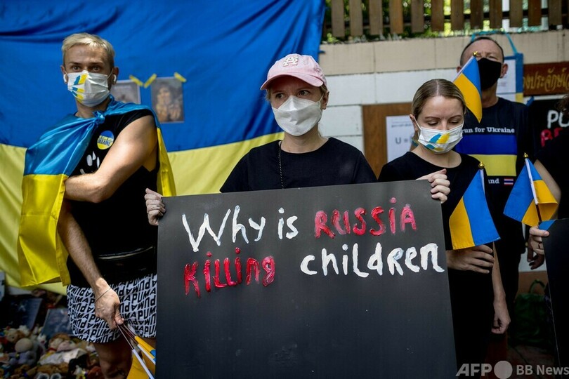 【4月20日】タイの首都バンコクのロシア大使館前で20日、ウクライナへの侵攻と同国マリウポリ(Mariupol)の子どもが殺されていることに対する抗議活動が行われた。