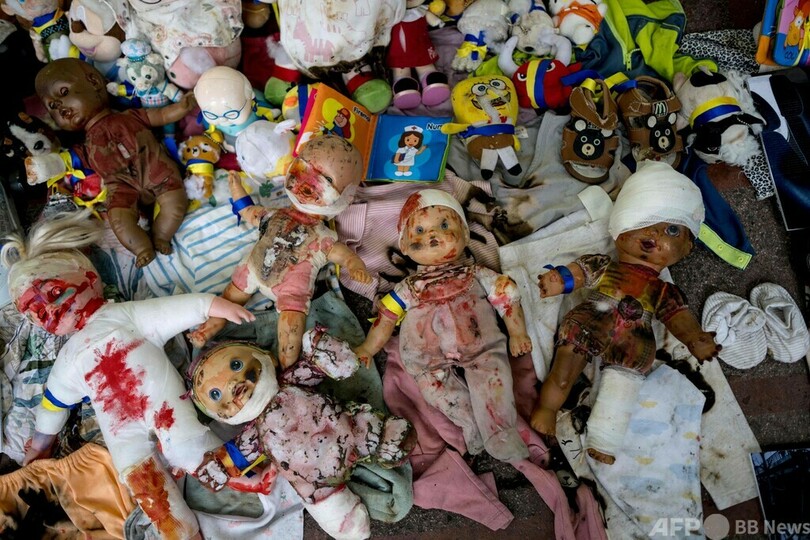 大使館前の道にはおもちゃや人形が置かれ、ウクライナ国旗が掲げられた。「マリウポリの子どもの命を守って」や「ロシアは子どもを殺害」と書かれたボードを持つ人の姿も見られた。(c)AFP