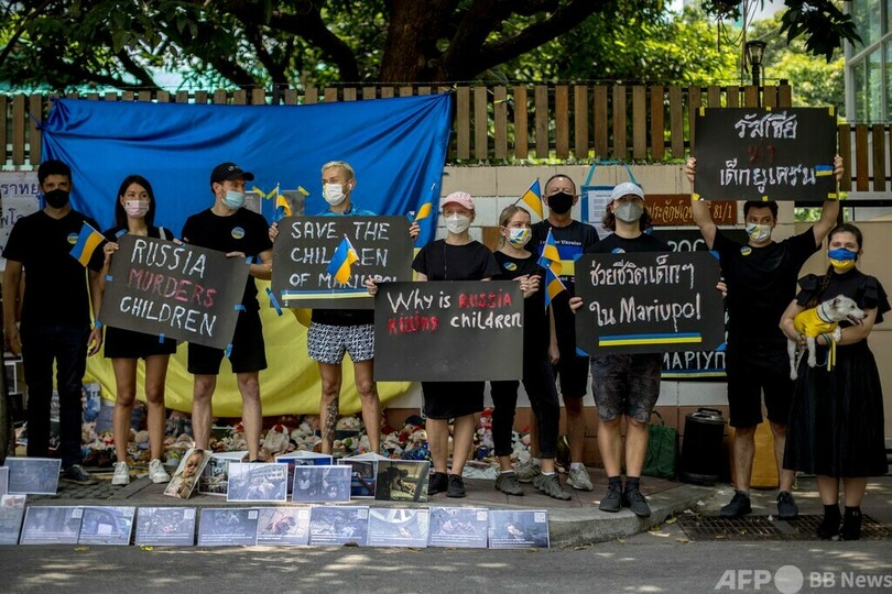 【4月20日】タイの首都バンコクのロシア大使館前で20日、ウクライナへの侵攻と同国マリウポリ(Mariupol)の子どもが殺されていることに対する抗議活動が行われた。