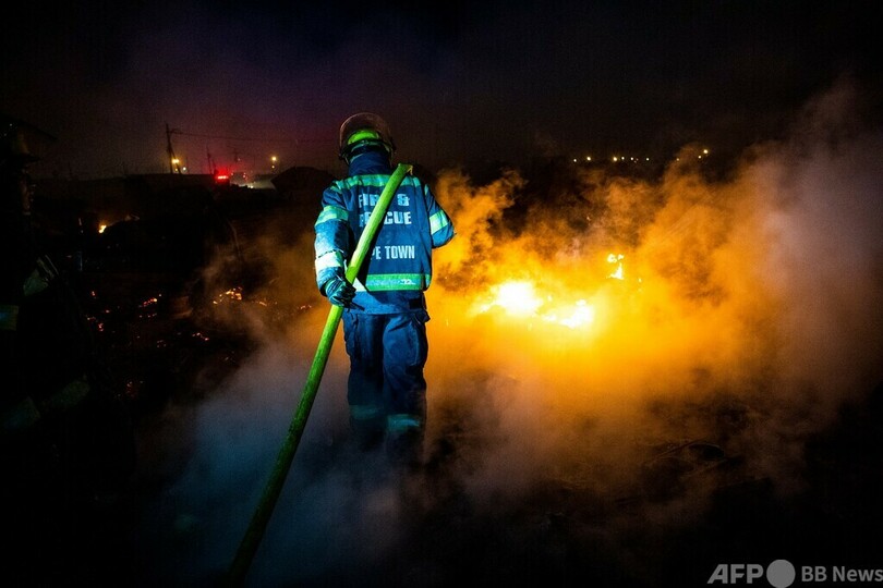 【4月24日 AFP】南アフリカ・ケープタウンの低所得者居住地の一つ、ランガ(Langa)のジョースロボ非公式居住区(Joe Slovo Informal Settlement)で消火に当たる消防隊員。