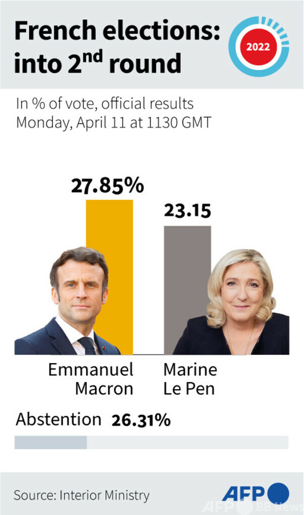 世論調査では、現職のエマニュエル・マクロン(Emmanuel Macron)氏が極右のマリーヌ・ルペン(Marine Le Pen)候補を大きくリードしているが、専門家は、投票率によってはルペン氏の勝利もあり得ると指摘している。(c)AFP