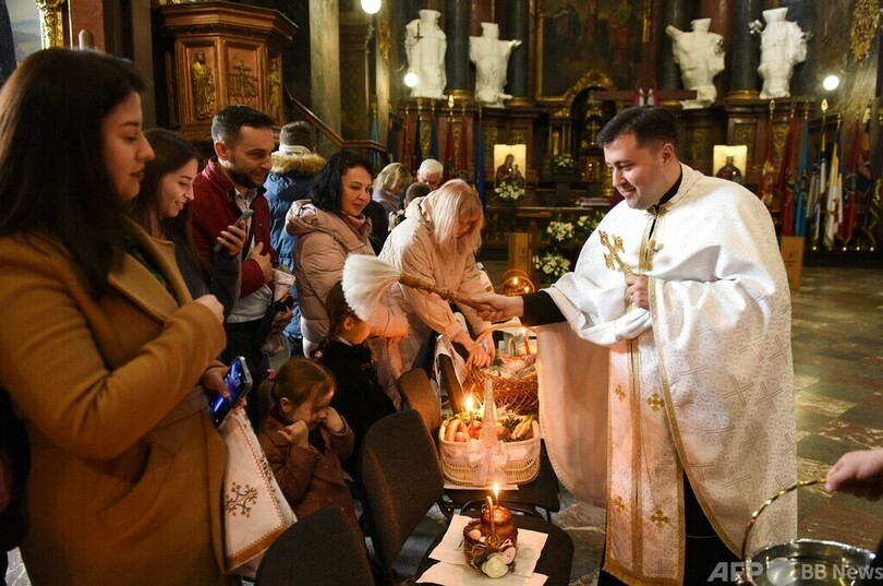 ニュース ライフ ウクライナ危機 ウクライナ各地で復活祭 兵士や住民が祈り 2022年4月25日 15:16 発信地:キーウ/ウクライナ [ ウクライナ ロシア・CIS ] このニュースをシェア ‹ › ❮ 26/31 ❯ ウクライナ西部リビウでイースター(復活祭)を祝い、信者に祝福を授ける東方正教会の司祭(2022年4月23日撮影)。(c)Yuriy Dyachyshyn / AFP 画像作成中 ! 【4月25日 AFP】ウクライナは24日、キリスト教東方正教会のイースター(Easter、復活祭)を迎えた。各地で復活祭を祝う行事が行われ、地元住民や兵士が参列して祈りをささげた。 東部リマン(Lyman)では遠くから砲撃音が聞こえる中、教会に集まった市民が司祭から祝福を受けた。(c)AFP 特集:ウクライナ危機 ロシアがウクライナに侵攻、世界は東西冷戦終結後最大の危機に直面している。 ライフ 一覧へ> メディア・報道関係・法人の方向け 写真・動画 購入のお問合せ>