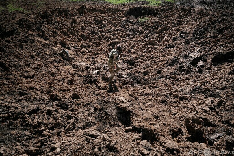 先週には、現在ウクライナ軍の基地として使われている廃校の近くにトーチカが着弾し、直径約15メートルの穴が残された。(c)AFP/Daphne ROUSSEAU