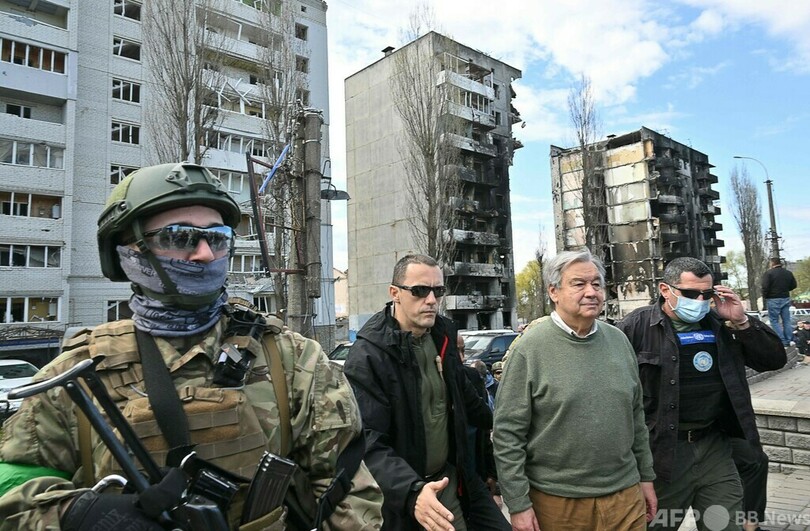 【4月28日 AFP】(更新、写真追加)国連(UN)のアントニオ・グテレス(Antonio Guterres)事務総長がウクライナを訪問し、28日にはロシア軍が民間人を殺害したとされる首都キーウ近郊のボロジャンカ(Borodianka)を視察した。
