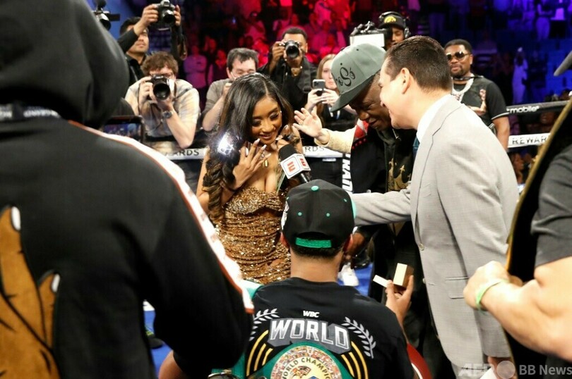 そしてその直後、スティーブンソンはリングに片膝をついて恋人のラッパー、ヤング・リリック(Young Lyric)にプロポーズし、「イエス」の返事をもらった。二人の間には娘がいる。(c)AFP