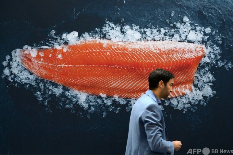 【5月10日 AFP】スペイン北東部バルセロナ(Barcelona)で開かれた世界最大のシーフード見本市「シーフード・エキスポ・グローバル(Seafood Expo Global)」で、サケの切り身を描いたポスターの前を歩く来場者。(c)AFP