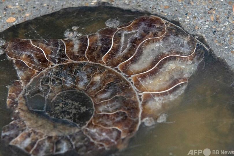 地元メディアの報道によると、この歩道は2年前に修繕工事が行われており、下請け業者がアンモナイトを貝殻の飾りのつもりでコンクリートに埋め込んだ可能性があるという。(c)AFP