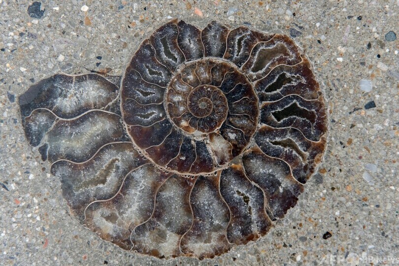 地元メディアの報道によると、この歩道は2年前に修繕工事が行われており、下請け業者がアンモナイトを貝殻の飾りのつもりでコンクリートに埋め込んだ可能性があるという。(c)AFP