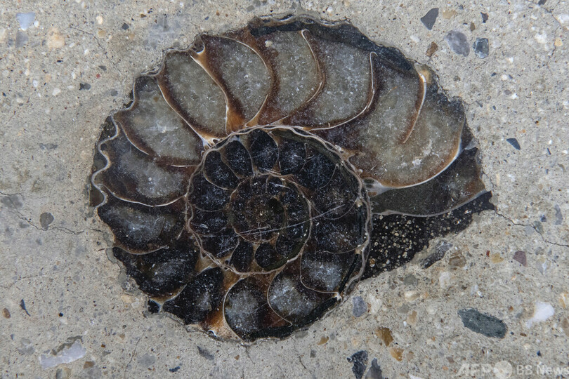 地元メディアの報道によると、この歩道は2年前に修繕工事が行われており、下請け業者がアンモナイトを貝殻の飾りのつもりでコンクリートに埋め込んだ可能性があるという。(c)AFP