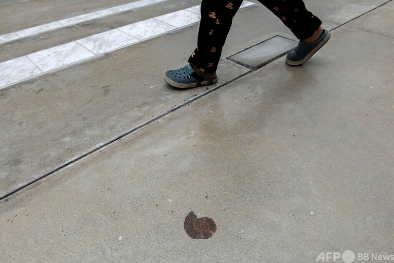 地元メディアの報道によると、この歩道は2年前に修繕工事が行われており、下請け業者がアンモナイトを貝殻の飾りのつもりでコンクリートに埋め込んだ可能性があるという。(c)AFP
