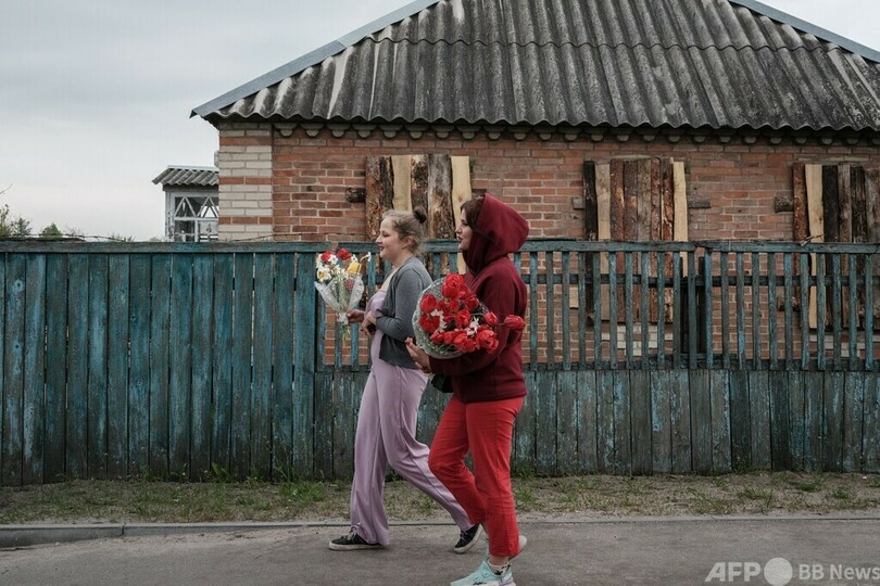 【5月8日 AFP】ウクライナ東部ライホロドク(Raihorodok)で、遠くの砲撃音が重く響きわたりウクライナ兵が通りすぎる中、母親の誕生日を祝うため花を届けるポリーナさん(15、右)といとこのナスチャさん(16)。(c)AFP
