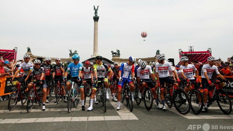 4キロの上りを経て、ハンガリー・ビシェグラード(Visegrad)の小高い丘にある城塞(じょうさい)跡でフィニッシュを迎えた開幕ステージ。最後のスプリント勝負では、スパートをかけたロット・ソウダル(Lotto Soudal)のカレブ・ユアン(Caleb Ewan、オーストラリア)が激しく転倒する場面もあった。(c)AFP