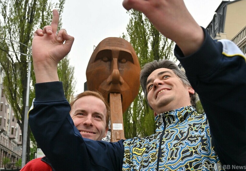 「拳銃」くわえたプーチン像、ウクライナ首都に設置