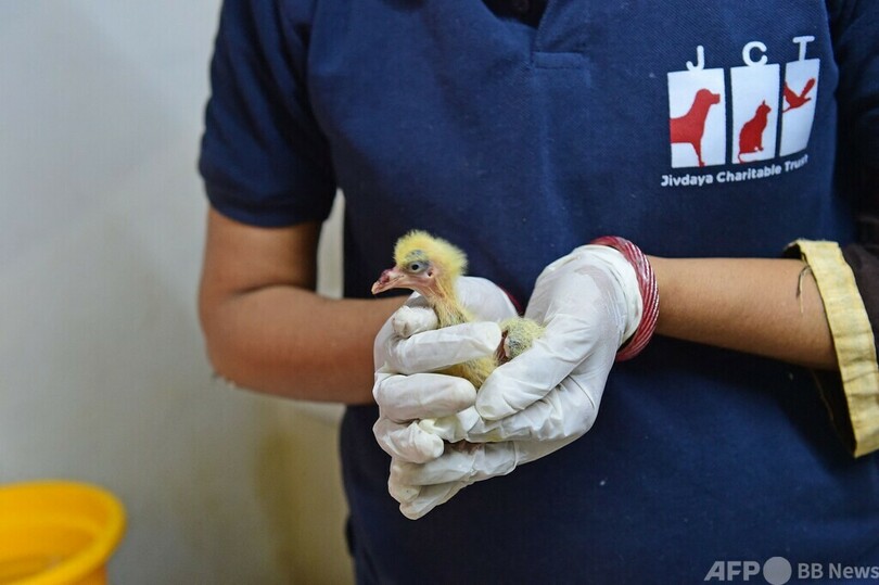 獣医師のニディ・シャルマ(Nidhi Sharma)氏(29)は、インコ1羽とチメドリのひな1羽の治療を終えると、歩道で保護されたタカ科の鳥のひなを診察した。水分補給効果のある液体を注射しながら「脱水症状が深刻だ」と話した。