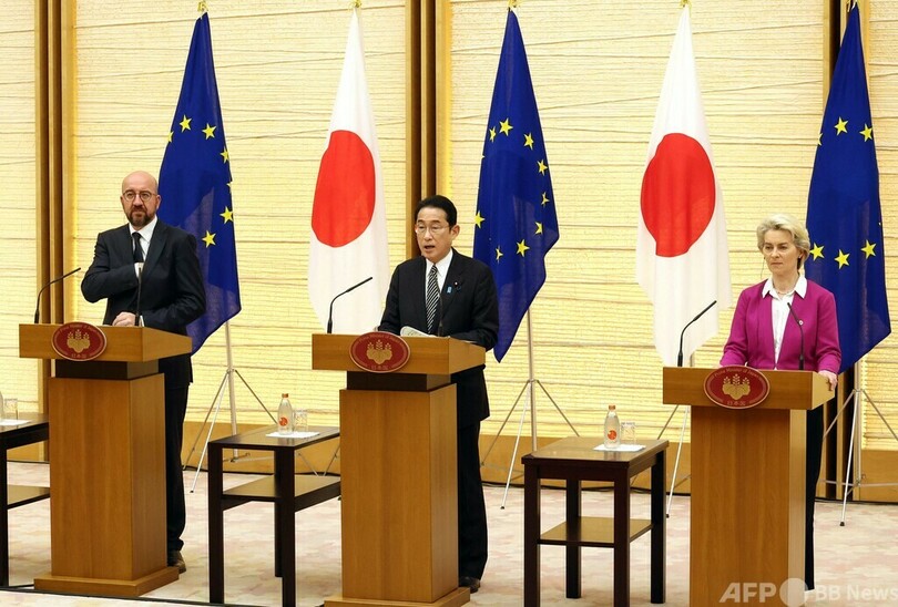 フォンデアライエン氏は、シャルル・ミシェル(Charles Michel)欧州理事会(European Council)常任議長(EU大統領)と共に定期首脳協議のため東京を訪問。岸田文雄(Fumio Kishida)首相と協議した後、「(ロシアは)きょう、ウクライナに野蛮な戦争を仕掛け、中国と憂慮すべき協定を結んでいることで、世界秩序に対する最も直接的な脅威となっている」と述べた。
