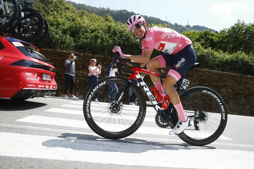 第4ステージで総合首位に浮上したトレック・セガフレード(Trek Segafredo)のフアン・ロペス(Juan Pedro Lopez Perez、スペイン)は、この日もマリアローザ(ピンクジャージー)を維持した。(c)AFP