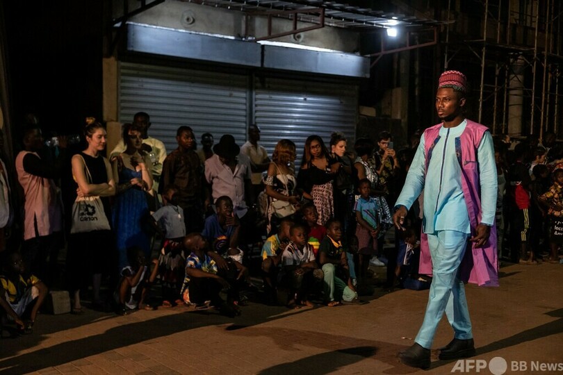会場となったダポヤ(Dapoya)地区の通りでは、スタイリッシュなファッションに身を包んで歩くモデルたちの様子に地元住民が見入った。(c)AFP