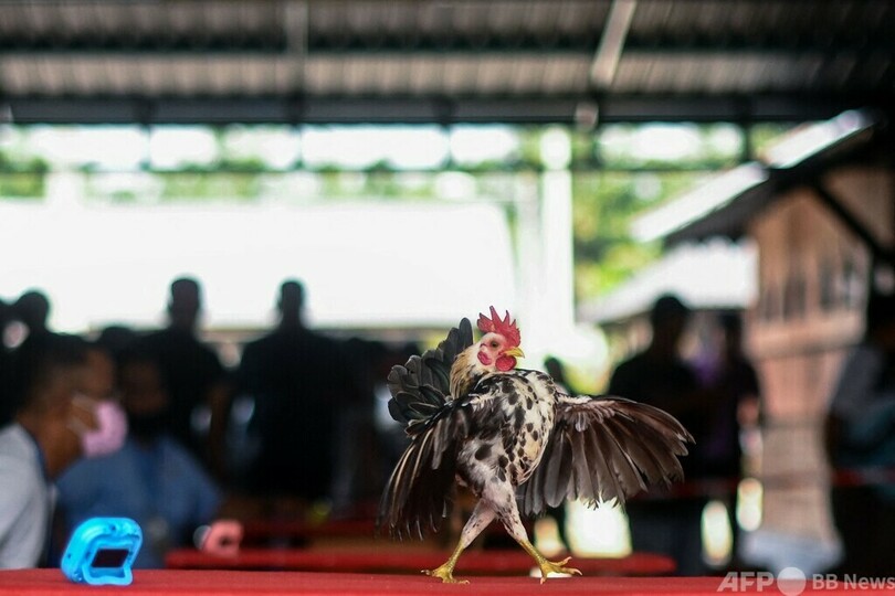 【5月25日 AFP】マレーシア・スランゴール(Selangor)州カンプンジェンジャロム(Kampung Jenjarom)で開催された鳥のビューティーコンテストに登場した、セラマという品種のニワトリ。(c)AFP