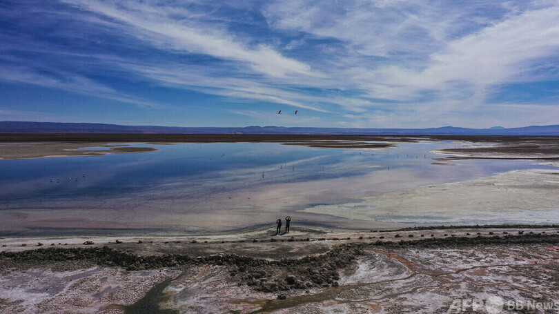 チリ北部サンペドロデアタカマのロスフラメンコス国立保護区にあるアタカマ塩原のチャクサ湖の空撮写真(2022年5月18日撮影)。(c)MARTIN BERNETTI / AFP