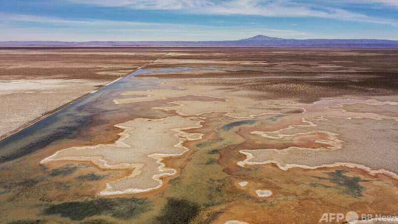 チリ北部サンペドロデアタカマのロスフラメンコス国立保護区にあるアタカマ塩原のチャクサ湖の空撮写真(2022年5月18日撮影)。(c)MARTIN BERNETTI / AFP