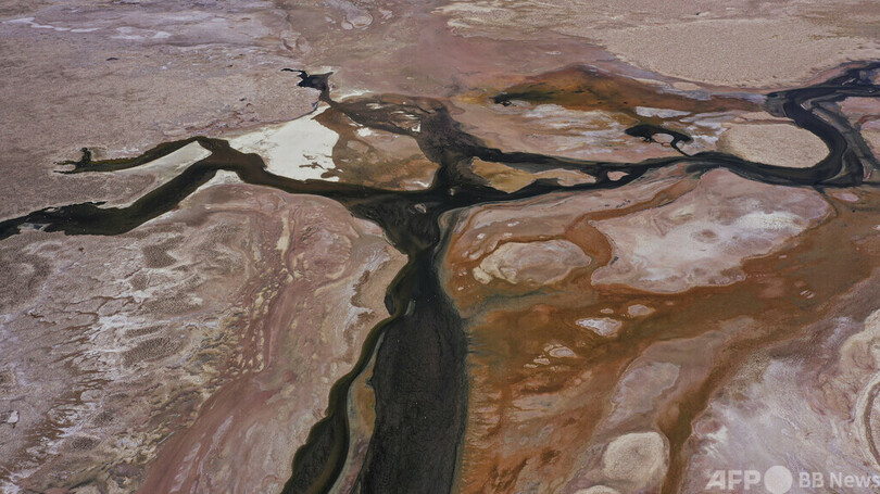 チリ北部サンペドロデアタカマのロスフラメンコス国立保護区にあるアタカマ塩原のチャクサ湖の空撮写真(2022年5月18日撮影)。(c)MARTIN BERNETTI / AFP