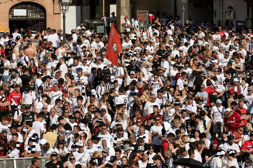 【5月20日 AFP】サッカーヨーロッパリーグ(UEFA Europa League 2021-22)を42年ぶりに制したドイツ・ブンデスリーガ1部のフランクフルト(Eintracht Frankfurt)の選手らが19日、地元に凱旋(がいせん)し、集まった大勢のサポーターに優勝を報告した。