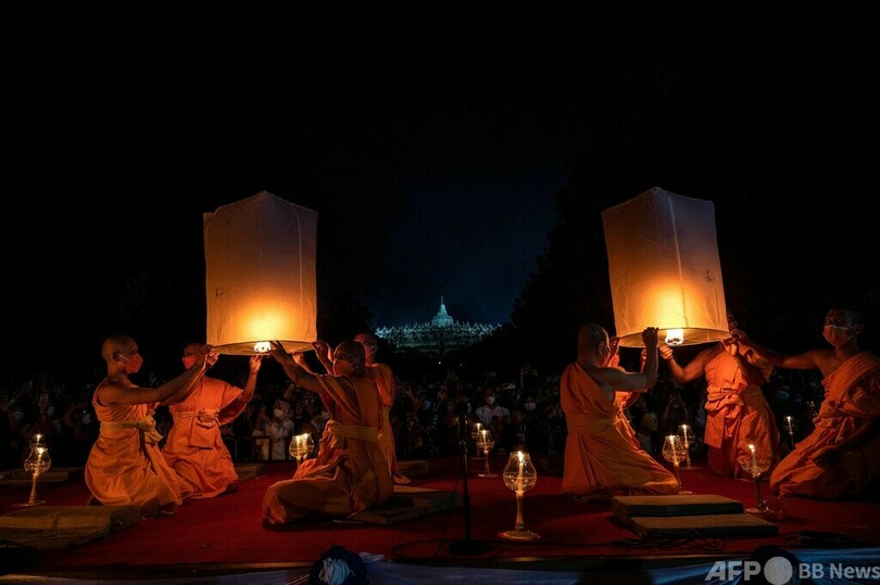 【5月27日 AFP】インドネシア・ジャワ(Java)島中部マゲラン(Magelang)にあるボロブドゥール寺院(Borobudur Temple)で行われた釈迦(しゃか、Buddha)の誕生、悟り、入滅を記念するウェーサク祭(Vesak Day)で、ランタンに火をともす信者。(c)AFP