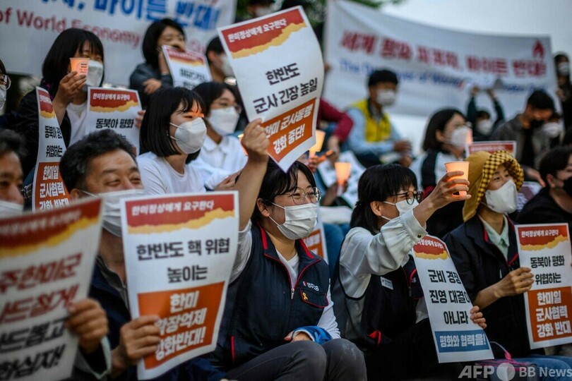 【5月21日 AFP】韓国ソウルで20日、ジョー・バイデン(Joe Biden)米大統領の訪韓に抗議するデモが行われた。デモは、バイデン氏が滞在しているとみられるホテル「グランドハイアット(Grand Hyatt)」前などで行われ、大学生らが参加した。(c)AFP