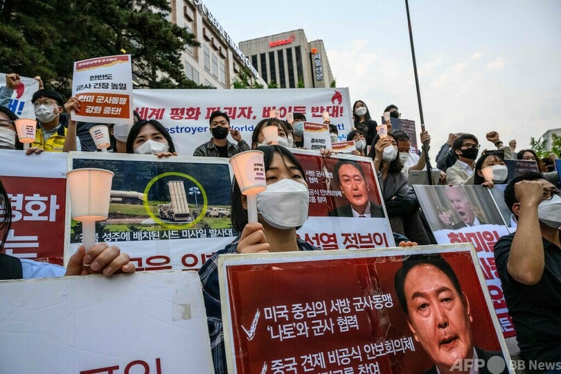 【5月21日 AFP】韓国ソウルで20日、ジョー・バイデン(Joe Biden)米大統領の訪韓に抗議するデモが行われた。デモは、バイデン氏が滞在しているとみられるホテル「グランドハイアット(Grand Hyatt)」前などで行われ、大学生らが参加した。(c)AFP