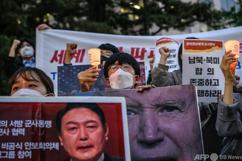【5月21日 AFP】韓国ソウルで20日、ジョー・バイデン(Joe Biden)米大統領の訪韓に抗議するデモが行われた。デモは、バイデン氏が滞在しているとみられるホテル「グランドハイアット(Grand Hyatt)」前などで行われ、大学生らが参加した。(c)AFP