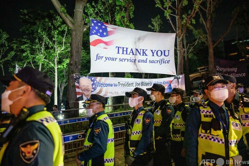 【5月21日 AFP】韓国ソウルで20日、ジョー・バイデン(Joe Biden)米大統領の訪韓に抗議するデモが行われた。デモは、バイデン氏が滞在しているとみられるホテル「グランドハイアット(Grand Hyatt)」前などで行われ、大学生らが参加した。(c)AFP