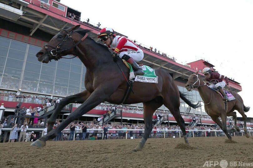 アーリーヴォーティングは序盤から先行すると、追う1番人気でジョエル・ロサリオ(Joel Rosario)騎手騎乗のエピセンター(Epicenter)を抑えて逃げ切った。エピセンターはケンタッキーダービーでも単勝80倍の穴馬リッチストライク(Rich Strike)に敗れて2着となっていたが、またしてもクラシックで悔しいレースに終わった。(c)AFP