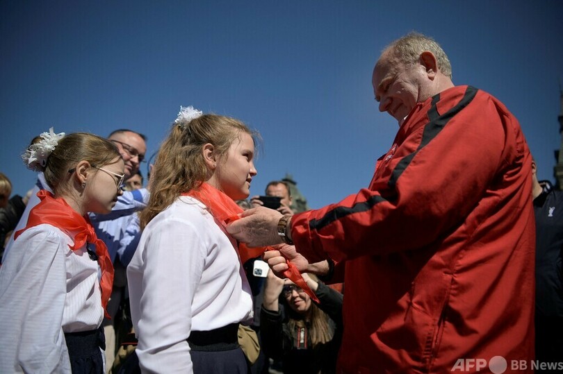 入団式にはロシア共産党のゲンナジー・ジュガーノフ(Gennady Zyuganov)委員長も出席。子どもたちの首にピオネールを象徴する赤いスカーフを巻いた。(c)AFP