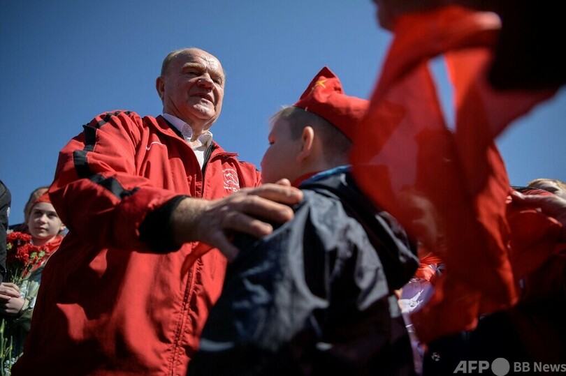 入団式にはロシア共産党のゲンナジー・ジュガーノフ(Gennady Zyuganov)委員長も出席。子どもたちの首にピオネールを象徴する赤いスカーフを巻いた。(c)AFP