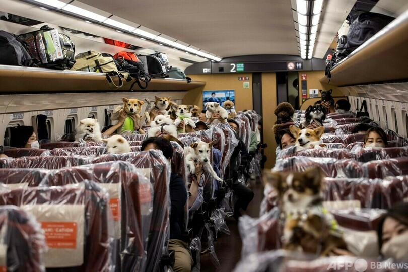 【5月28日 AFP】東京・上野から長野・軽井沢までの新幹線車両内で飼い犬を抱き上げる乗客。新幹線に乗車する際、飼い主は通常、犬をキャリーケースやケージに入れておかねばならないが、この日、ケースから出た犬は体を伸ばし、車窓からの眺めを楽しんだ。(c)AFP