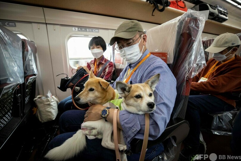 【5月28日 AFP】東京・上野から長野・軽井沢までの新幹線車両内で飼い犬を抱き上げる乗客。新幹線に乗車する際、飼い主は通常、犬をキャリーケースやケージに入れておかねばならないが、この日、ケースから出た犬は体を伸ばし、車窓からの眺めを楽しんだ。(c)AFP
