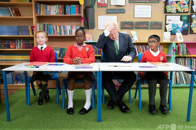 【6月2日 AFP】英ロンドン南東部にある聖メアリークレイ小学校(St Mary Cray Primary Academy)で、生徒たちと席に着くボリス・ジョンソン(Boris Johnson)英首相。首相はこの日訪れた同校で、コロナ禍中の学習の遅れを取り戻すために、生徒にどのような指導が行われているか視察した。(c)AFP