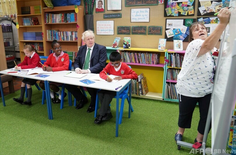 【6月2日 AFP】英ロンドン南東部にある聖メアリークレイ小学校(St Mary Cray Primary Academy)で、生徒たちと席に着くボリス・ジョンソン(Boris Johnson)英首相。首相はこの日訪れた同校で、コロナ禍中の学習の遅れを取り戻すために、生徒にどのような指導が行われているか視察した。(c)AFP