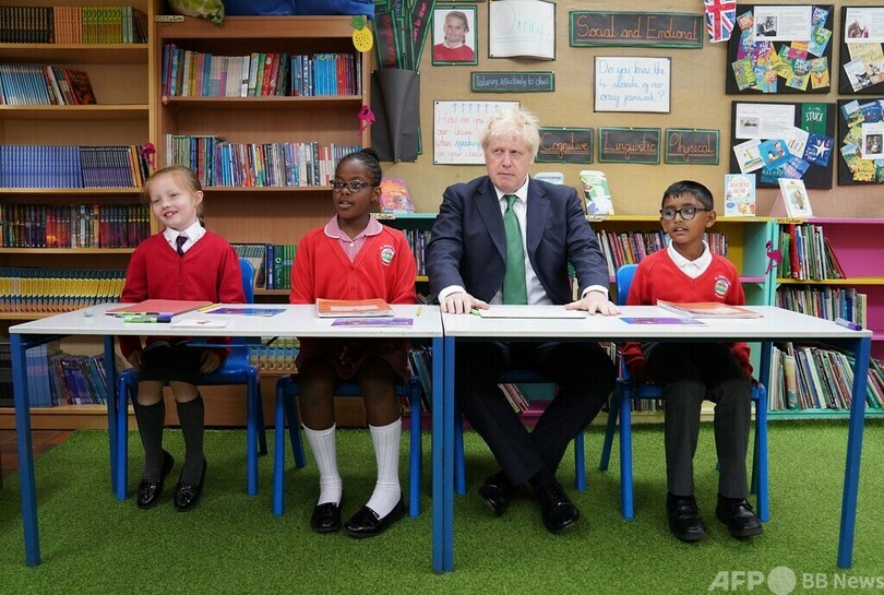 【6月2日 AFP】英ロンドン南東部にある聖メアリークレイ小学校(St Mary Cray Primary Academy)で、生徒たちと席に着くボリス・ジョンソン(Boris Johnson)英首相。首相はこの日訪れた同校で、コロナ禍中の学習の遅れを取り戻すために、生徒にどのような指導が行われているか視察した。(c)AFP
