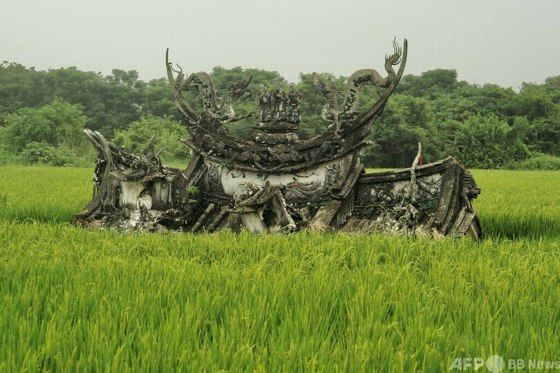 ニュース ライフ 今日の1枚 【今日の1枚】土中から出現、田んぼの寺 台湾 2022年6月3日 12:15 発信地:嘉義/台湾 [ 中国・台湾 ] このニュースをシェア ‹ › ❮ 2/3 ❯ 台湾・嘉義の稲田にある、1959年に洪水で沈んだ道教の五福寺院の遺構(2022年5月21日撮影)。(c)Sam Yeh / AFP 画像作成中 ! 【6月3日 AFP】台湾・嘉義(Chiayi)で、1959年に洪水で沈んだ道教の五福(Wu Fu)寺院の遺構を囲むように広がる稲田を手入れする農家を捉えた空撮写真。(c)AFP ライフ 一覧へ> メディア・報道関係・法人の方向け 写真・動画 購入のお問合せ>