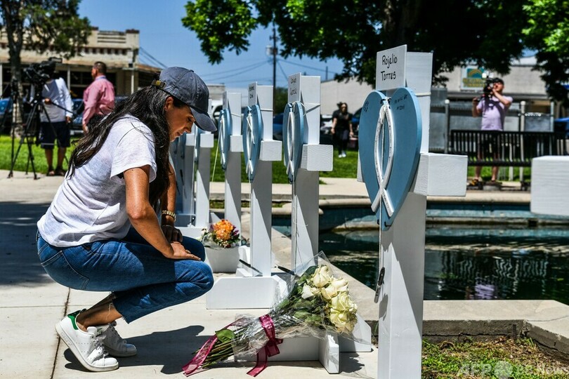 【5月27日 AFP】英国のヘンリー英王子(Prince Harry)の妻メーガン妃(Meghan, Duchess of Sussex)は26日、小学校で銃乱射事件が起きた米南部テキサス州ユバルディ(Uvalde)を予告なく訪問し、死亡した児童19人と教員2人を追悼した。