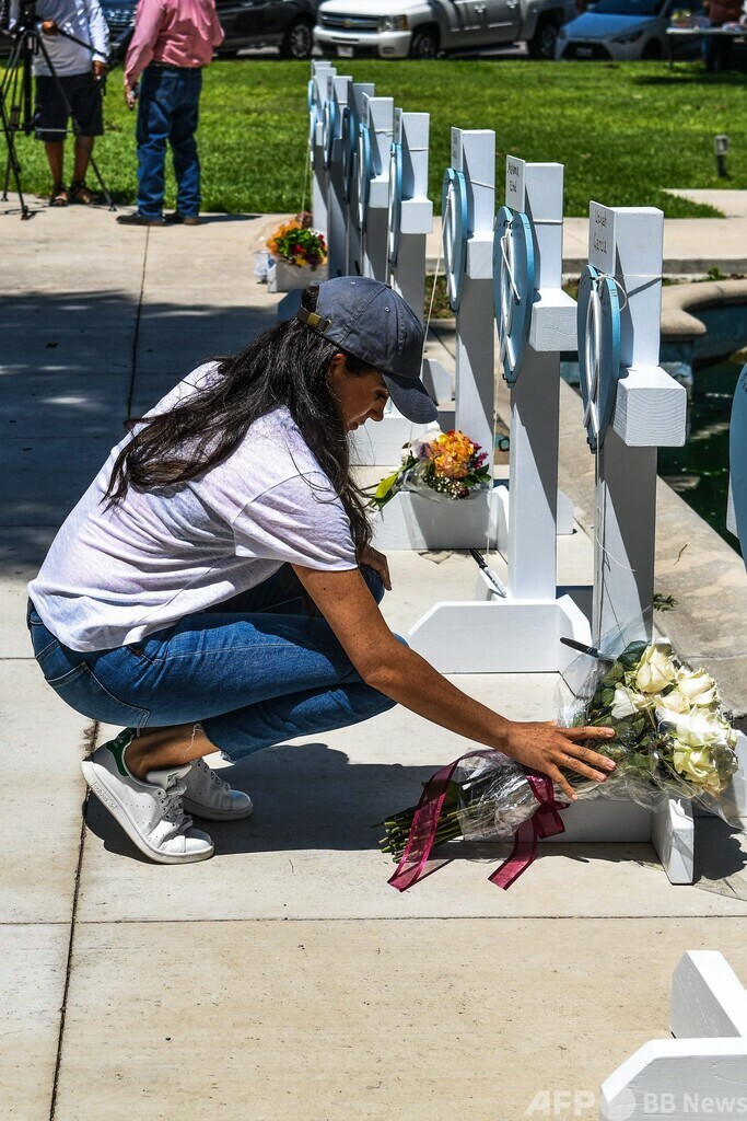 【5月27日 AFP】英国のヘンリー英王子(Prince Harry)の妻メーガン妃(Meghan, Duchess of Sussex)は26日、小学校で銃乱射事件が起きた米南部テキサス州ユバルディ(Uvalde)を予告なく訪問し、死亡した児童19人と教員2人を追悼した。