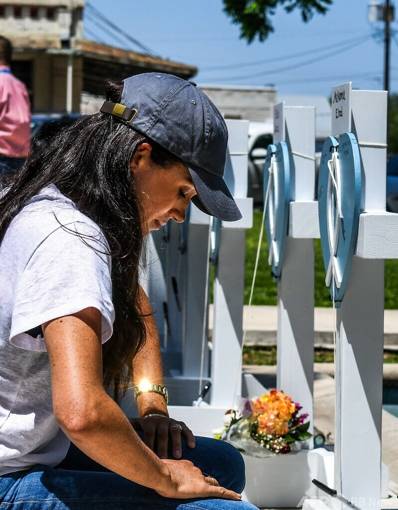 メーガン妃はジーンズにTシャツ、青い野球帽といういでたちだった。郡庁舎前に設置された白い十字架に花を手向け、十字架に刻まれた犠牲者の名前などを見て回った。