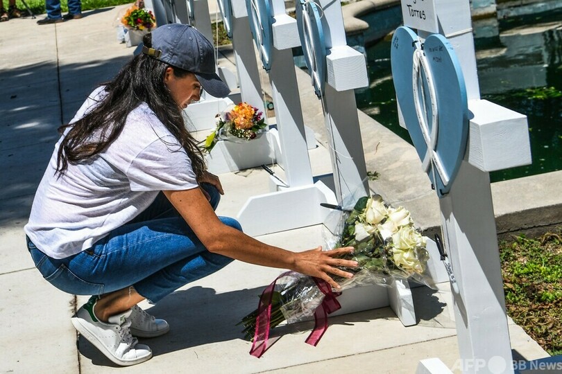 【5月27日 AFP】英国のヘンリー英王子(Prince Harry)の妻メーガン妃(Meghan, Duchess of Sussex)は26日、小学校で銃乱射事件が起きた米南部テキサス州ユバルディ(Uvalde)を予告なく訪問し、死亡した児童19人と教員2人を追悼した。