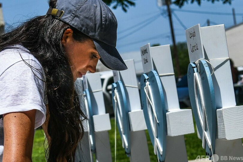 【5月27日 AFP】英国のヘンリー英王子(Prince Harry)の妻メーガン妃(Meghan, Duchess of Sussex)は26日、小学校で銃乱射事件が起きた米南部テキサス州ユバルディ(Uvalde)を予告なく訪問し、死亡した児童19人と教員2人を追悼した。