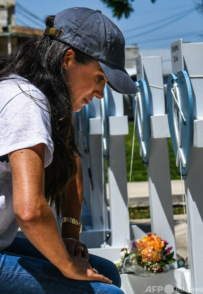 メーガン妃はジーンズにTシャツ、青い野球帽といういでたちだった。郡庁舎前に設置された白い十字架に花を手向け、十字架に刻まれた犠牲者の名前などを見て回った。