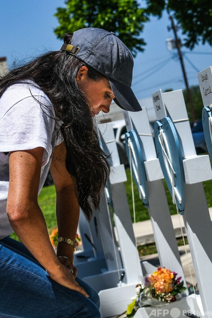 【5月27日 AFP】英国のヘンリー英王子(Prince Harry)の妻メーガン妃(Meghan, Duchess of Sussex)は26日、小学校で銃乱射事件が起きた米南部テキサス州ユバルディ(Uvalde)を予告なく訪問し、死亡した児童19人と教員2人を追悼した。
