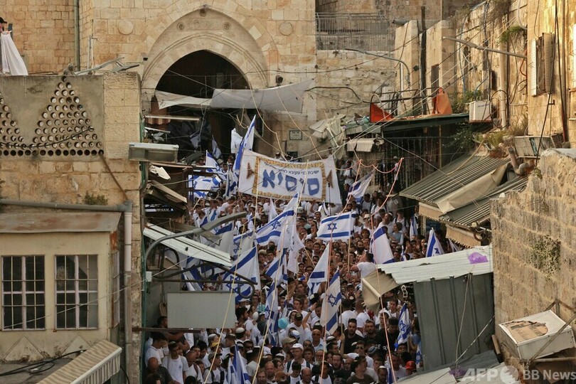 【5月30日 AFP】中東エルサレムで29日、ユダヤ人の民族主義者ら約7万人がイスラエル国旗を掲げて旧市街(Old City)を行進した。参加者の一部は「アラブ人に死を」と叫びながら歩き、パレスチナ人住民は建物の上から物を投げるなどして反発した。