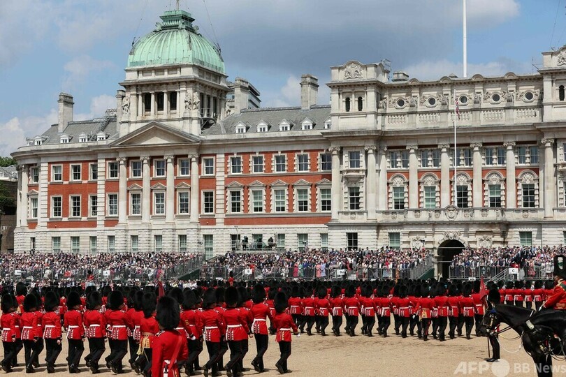 女王をめぐっては、健康不安から行事に出席できない可能性も取り沙汰されていたが、パレードを見守り、笑顔で声援に応えた。(c)AFP